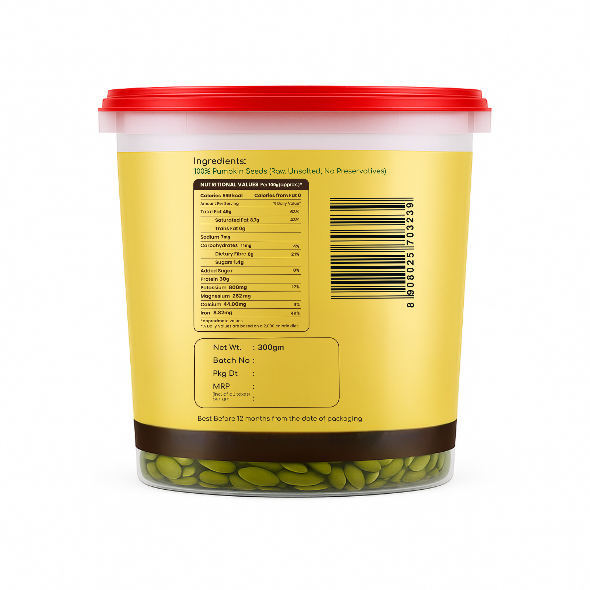 Pumpkin seeds are a powerhouse of plant-based protein, dietary fiber, and essential minerals. With 30g of protein per 100g, they are ideal for those looking to add clean nutrition to their daily diet. The 6g of fiber per serving supports digestion, while essential nutrients like iron, magnesium, potassium, and zinc contribute to energy, bone health, and overall wellness.